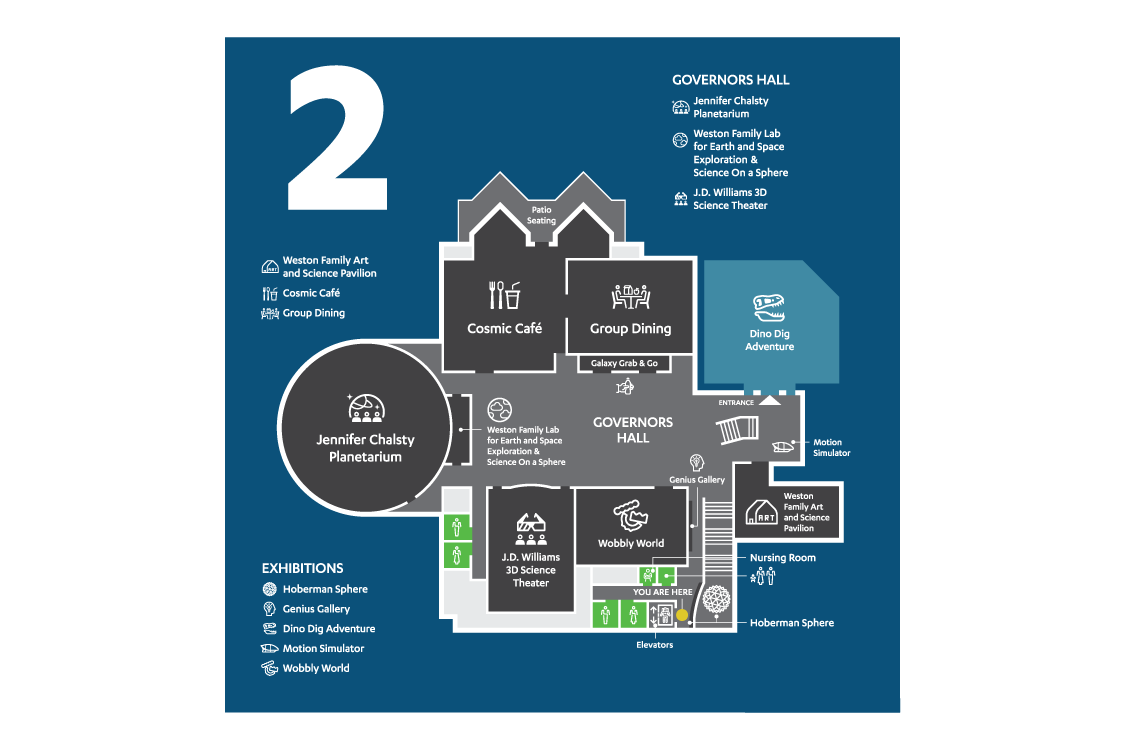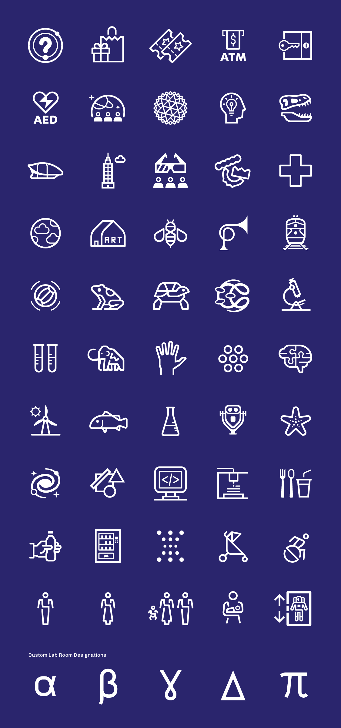 Custom set of icons created for Liberty Science Center’s newly installed signage and wayfinding program. Icons were drawn for the Center’s permanent exhibit spaces, attractions, learning labs and varied amenities including the gift shop, café and theaters. How wonderful to be able to illustrate everything from astronauts to mammoths, wind turbines to 3D printers. The icons are prominently featured on maps I developed for the Center’s directory information signage.